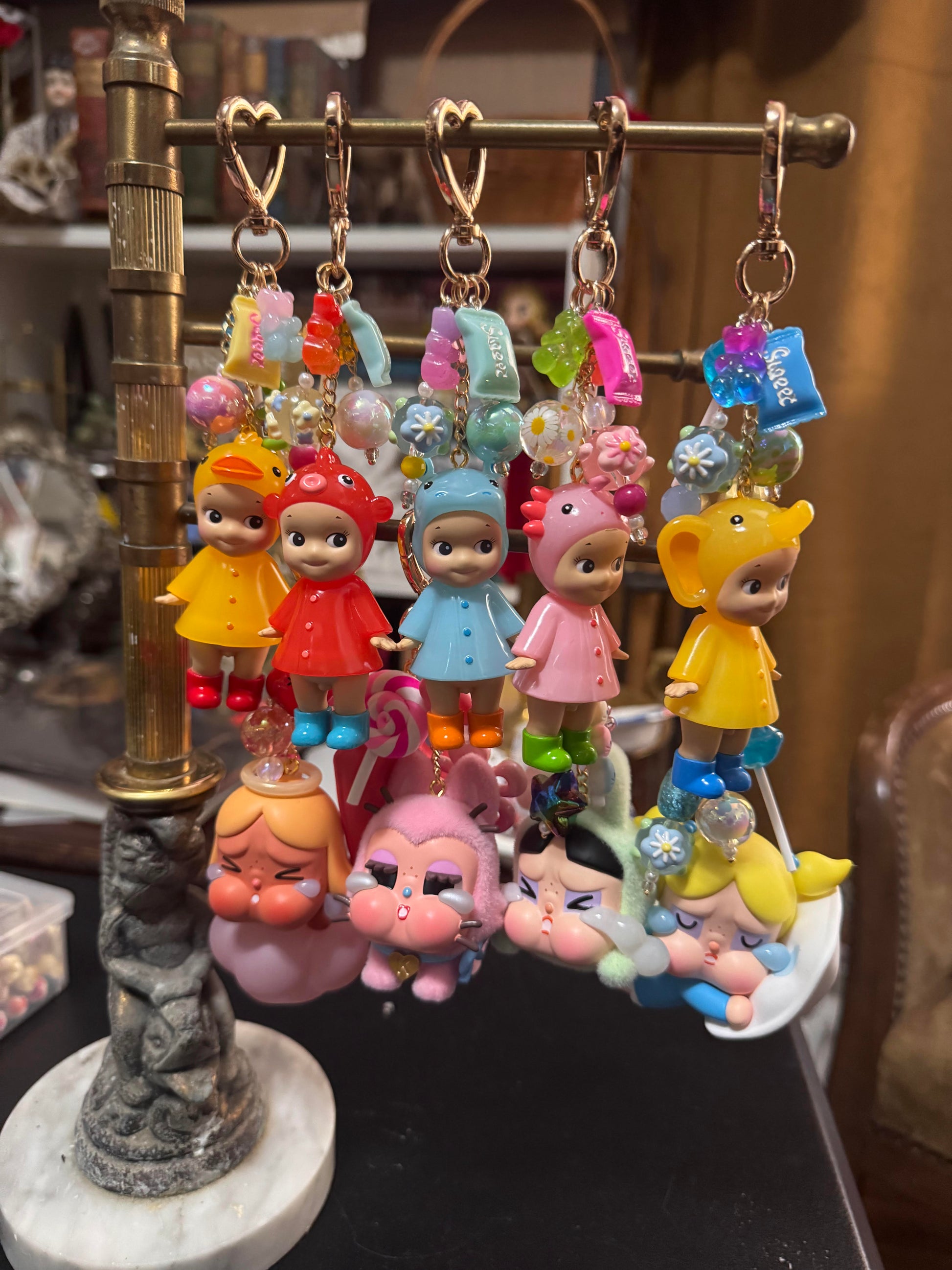 This collection blends whimsical childhood nostalgia with functional design. Contains a Gold toned, heart shaped carabiner and acrylic beads representing childhood sweets, such as candies, gummy bears and lollipops. piece's variation in shapes, colors, and charms adds to its individuality, making them fun additions for bags or as charms.