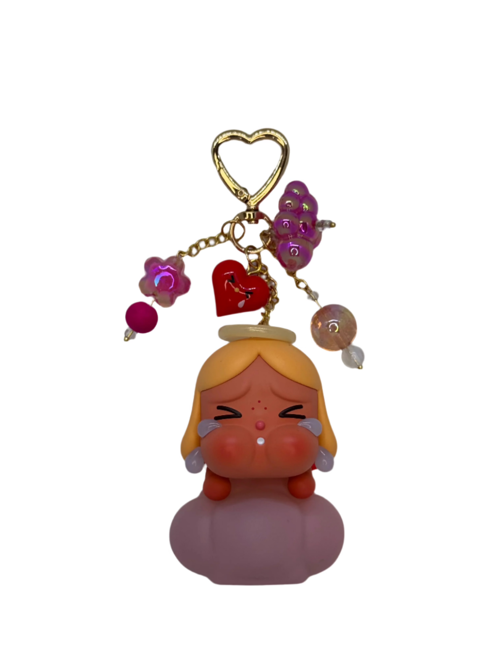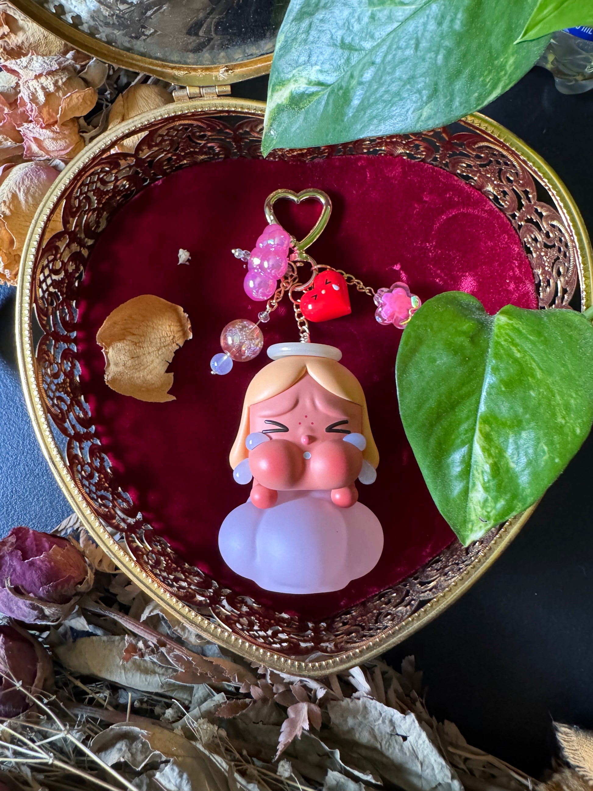 This altered figure wears a cherub’s face but carries the mood of someone who's been through it. Sweet but not innocent, soft but not fragile. Hand-detailed by Jasmin with vintage trims and quiet humor.