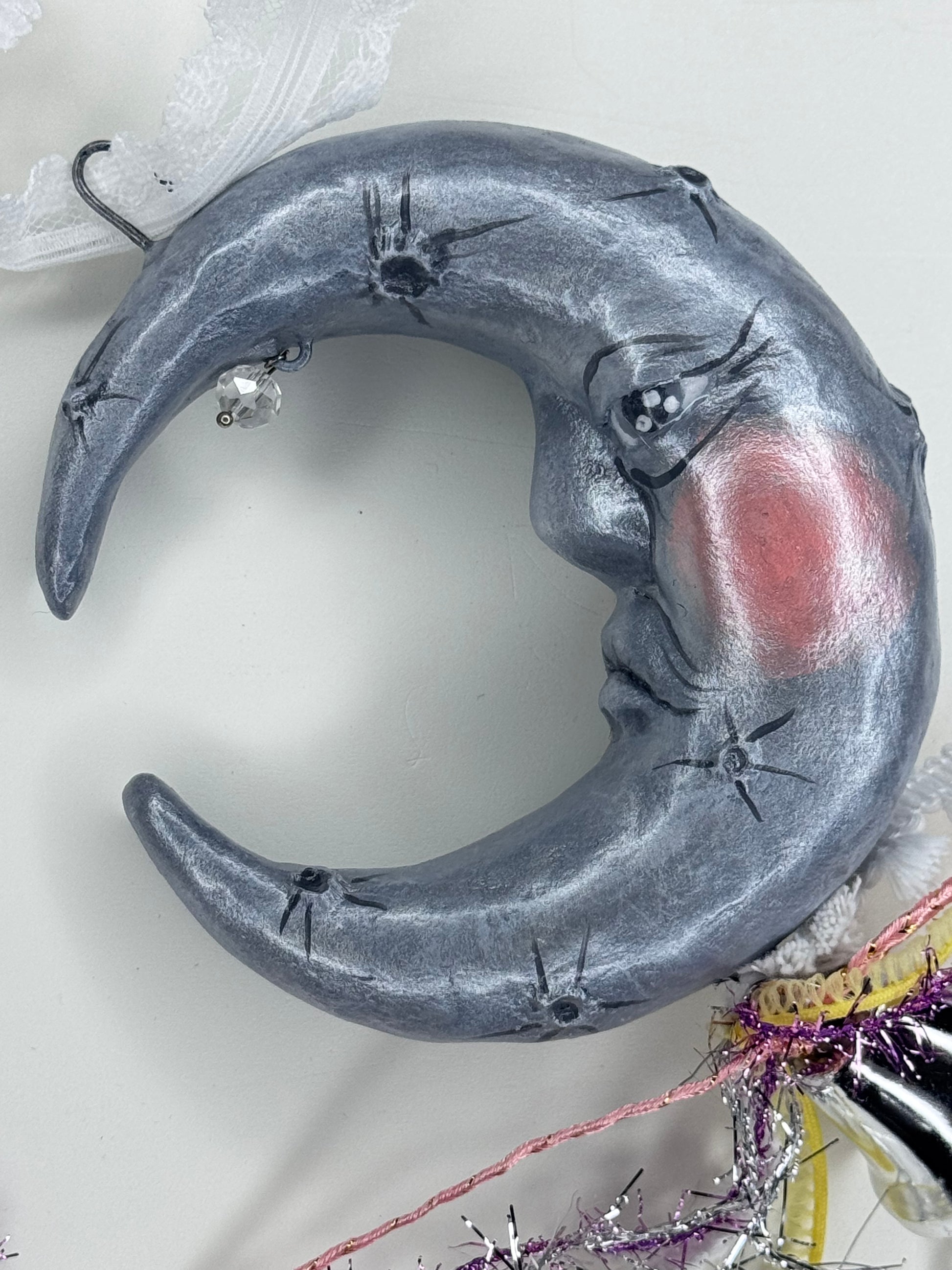 Inspired by vintage and traditional Christmas ornaments. Also inspired by late 1800’s/early 1900’s photo shoots, 1902’s film “A trip to the moon” by Georges Méliès and vintage storybooks. These expressive moons bring magic, joy and nostalgia where ever you choose to display them.