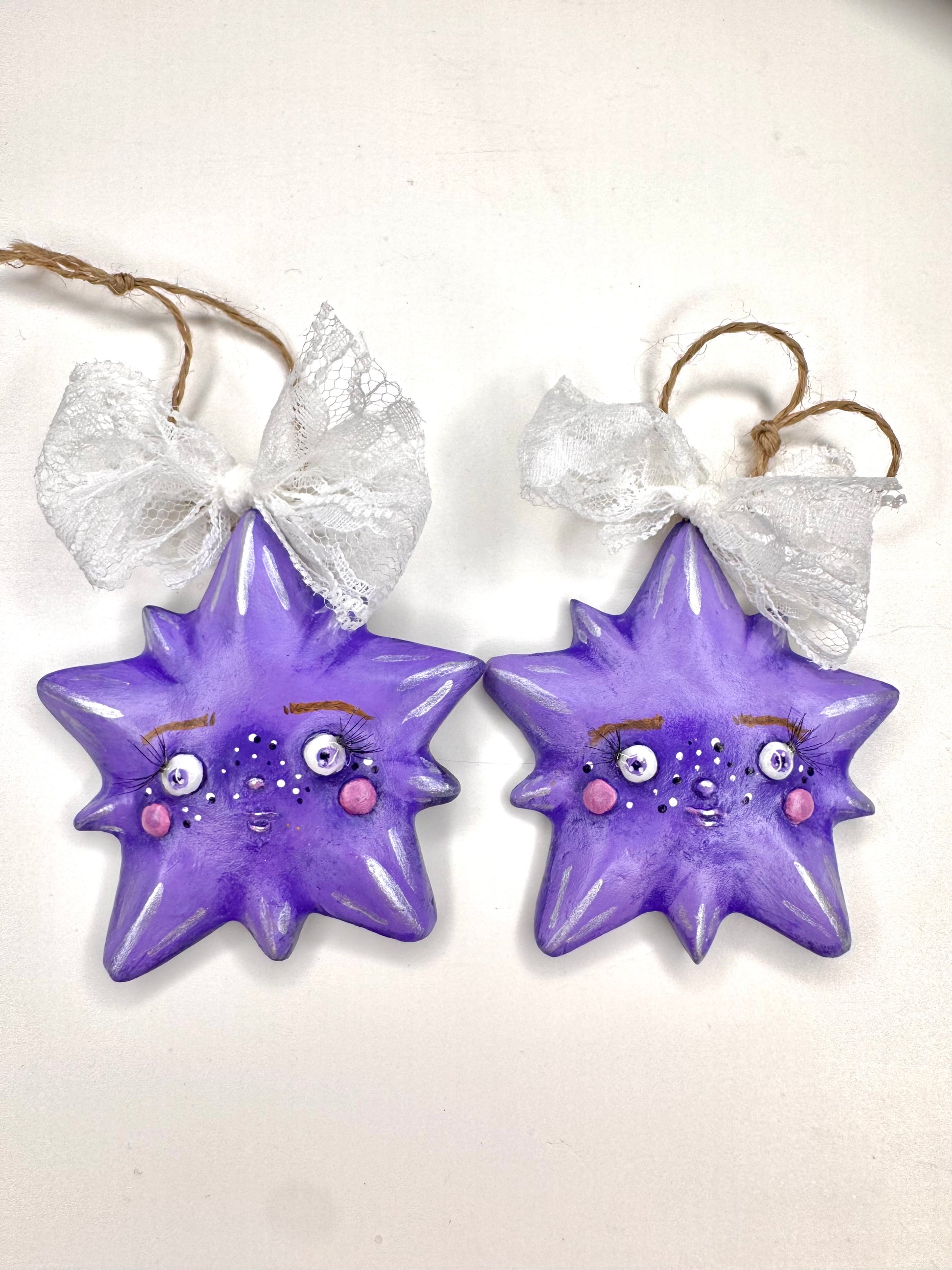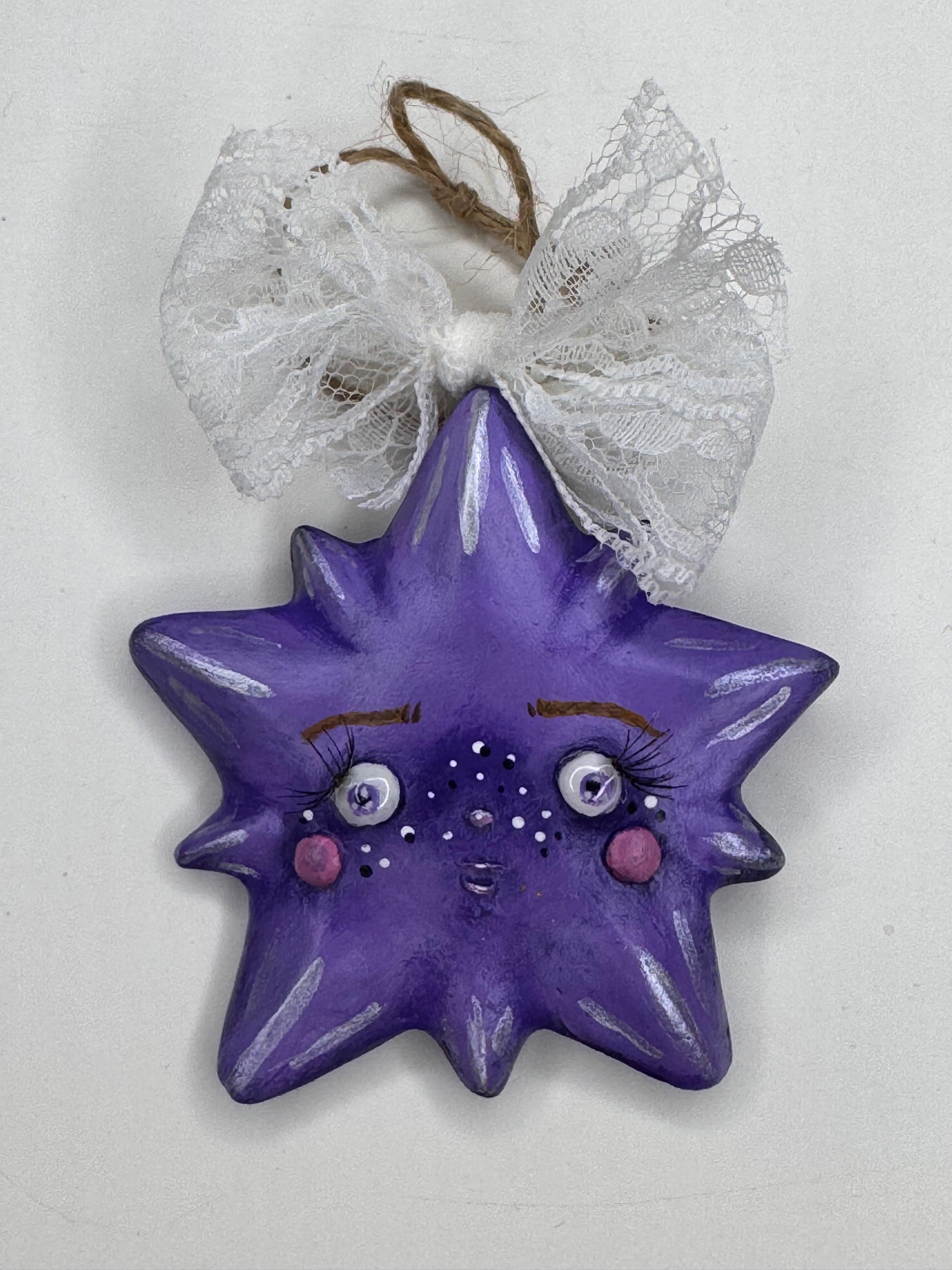 Each ornament is a miniature work of art, meticulously hand-painted with watercolors and acrylics and finished with a delicate lace bow. The eyes of each star are adorned with wispy eyelashes and are glazed with UV resin for extra durability and shine.